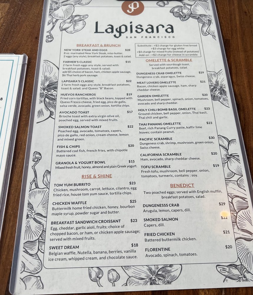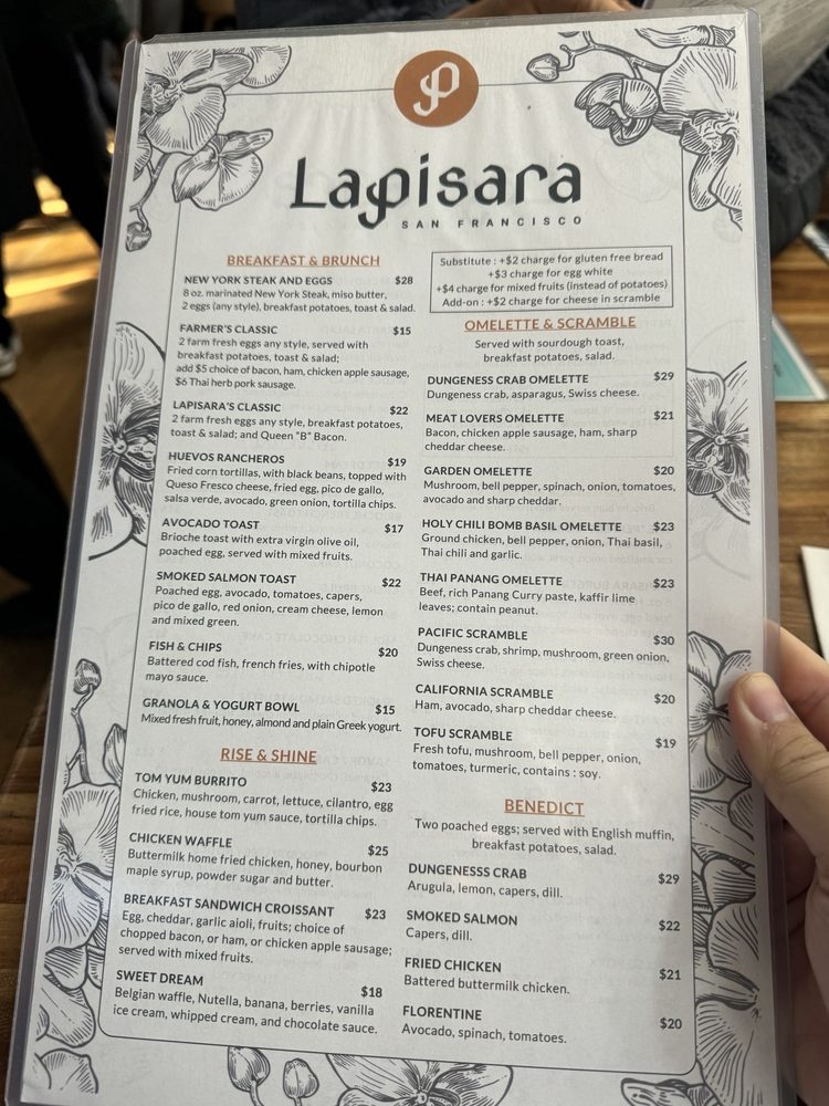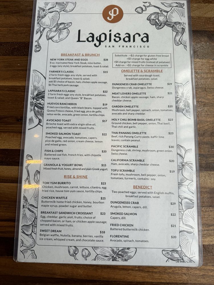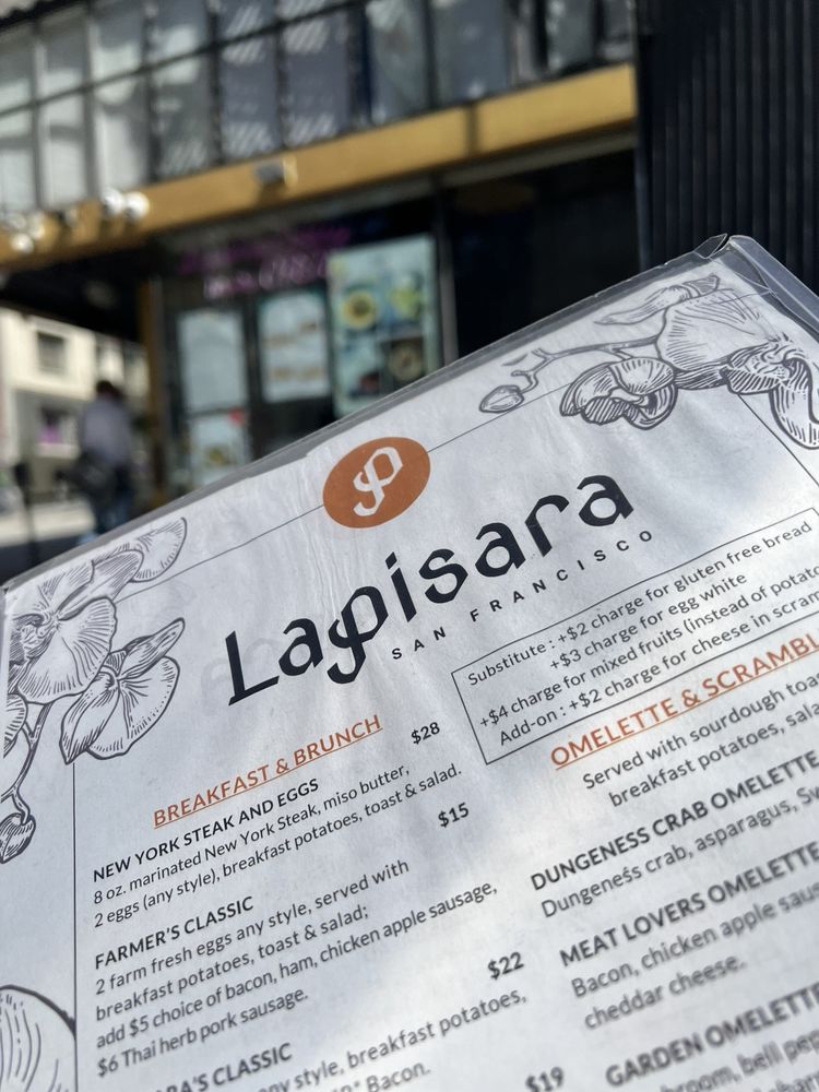 Lapisara Eatery, located in San Francisco, offers a unique fusion of Thai cuisine with a focus on breakfast and brunch items. The menu features innovative dishes like the Tom Yum Burrito and Fried Chicken Benedict, alongside classic options like Chicken and Waffles and Huevos Rancheros. The ambiance is described as casual, trendy, and intimate, making it a great spot for a cozy meal. Customers praise the attentive service and the creative presentation of dishes, such as the adorable upside-down teddy bear cup for coffees and lattes. The menu also caters to vegans and vegetarians, with a variety of options available. Overall, Lapisara Eatery stands out for its delicious food and welcoming atmosphere, making it a must-visit spot for those looking for a unique dining experience in the area.