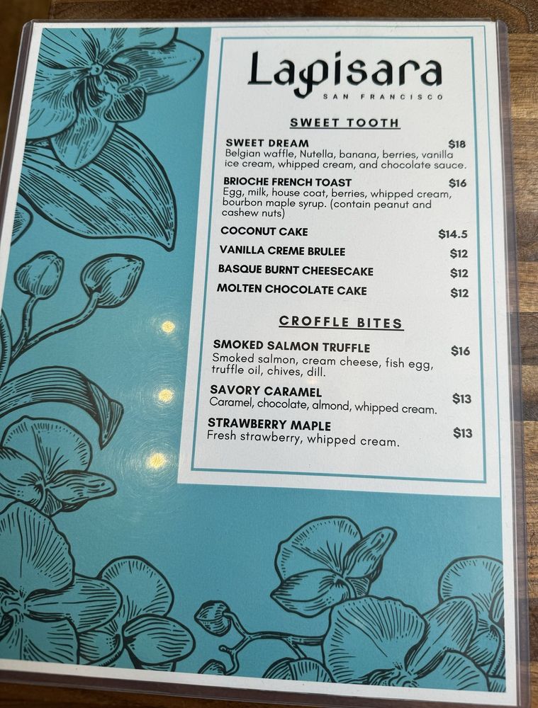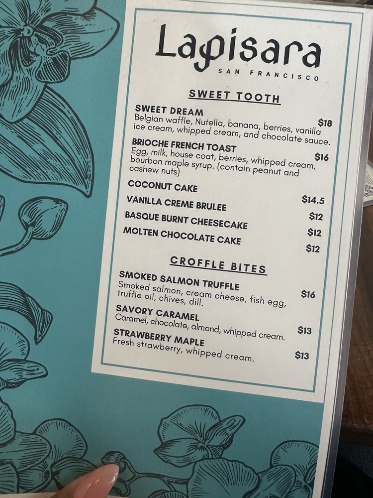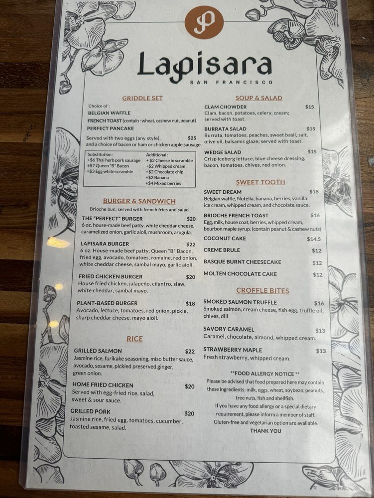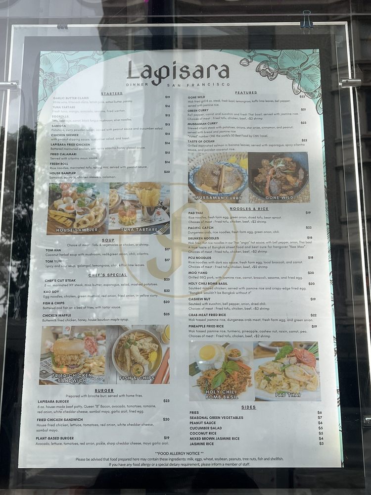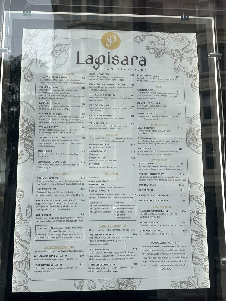 Lapisara Eatery, located in San Francisco, offers a unique fusion of Thai cuisine with a focus on breakfast and brunch items. The menu features innovative dishes like the Tom Yum Burrito and Fried Chicken Benedict, alongside classic options like Chicken and Waffles and Huevos Rancheros. The ambiance is described as casual, trendy, and intimate, making it a great spot for a cozy meal. Customers praise the attentive service and the creative presentation of dishes, such as the adorable upside-down teddy bear cup for coffees and lattes. The menu also caters to vegans and vegetarians, with a variety of options available. Overall, Lapisara Eatery stands out for its delicious food and welcoming atmosphere, making it a must-visit spot for those looking for a unique dining experience in the area.
